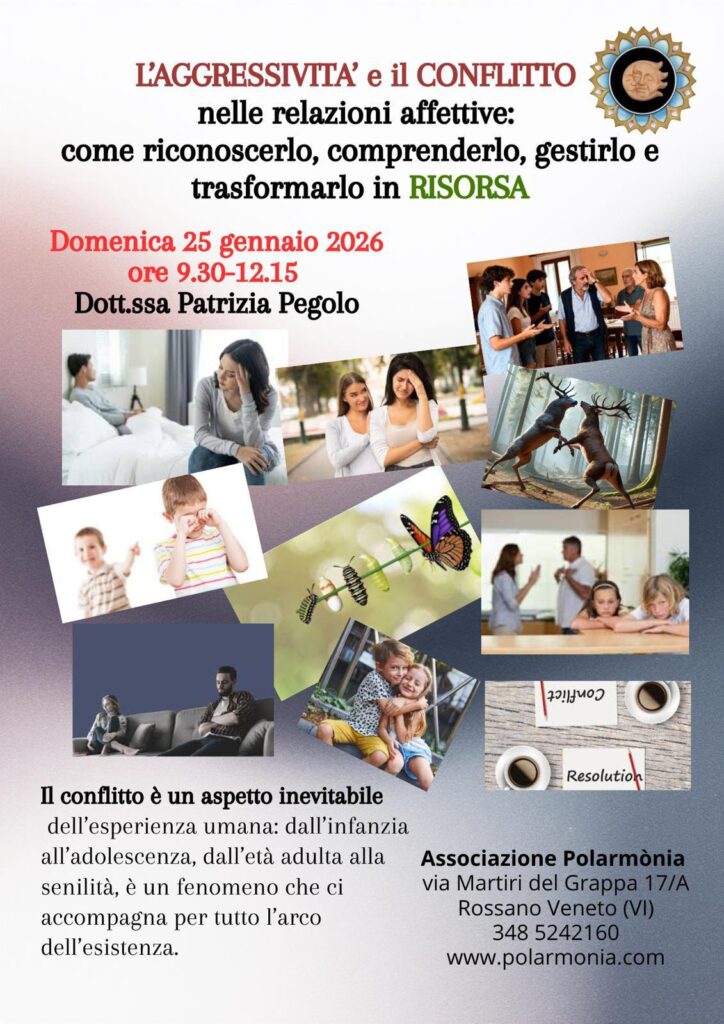Vi presentiamo il prossimo evento dell’Associazione Polarmònia: un seminario teorico esperienziale riguardante tematiche RELAZIONALI dal titolo: “L’aggressività e il conflitto nelle relazioni affettive: come riconoscerlo, comprenderlo, gestirlo e trasformarlo in RISORSA”, tenuto dalla nostra Presidente, la Dott.ssa Patrizia Pegolo, DOMENICA 25 GENNAIO dalle 9.30 alle 12.15.